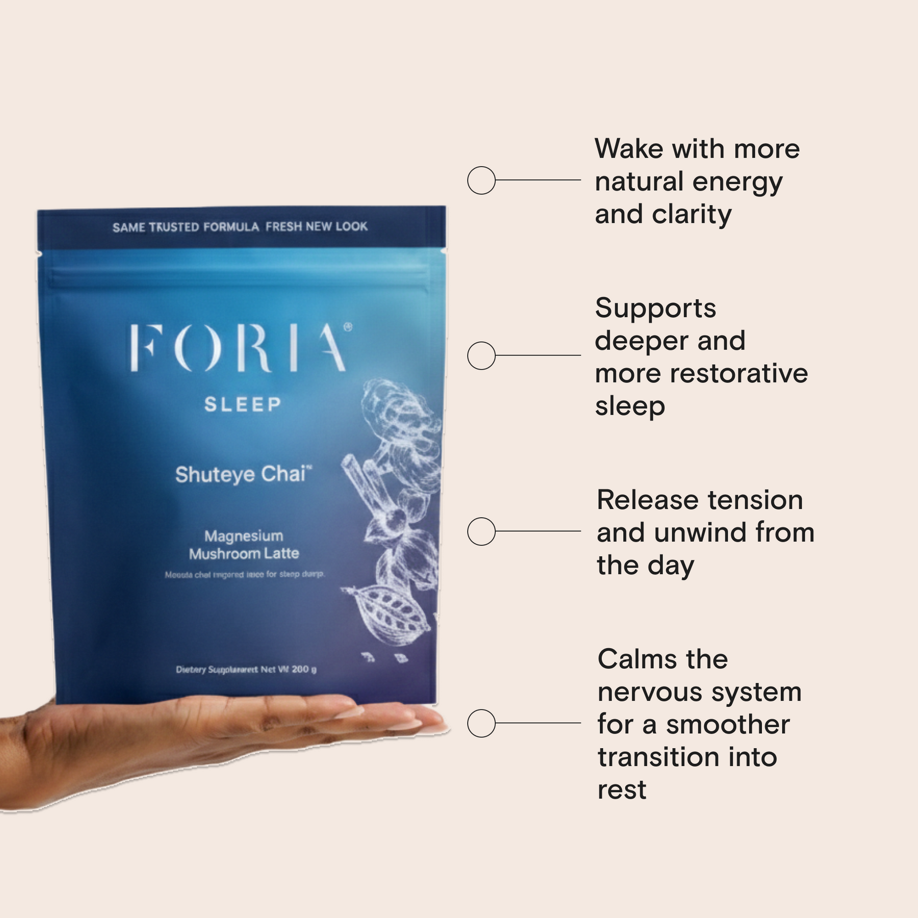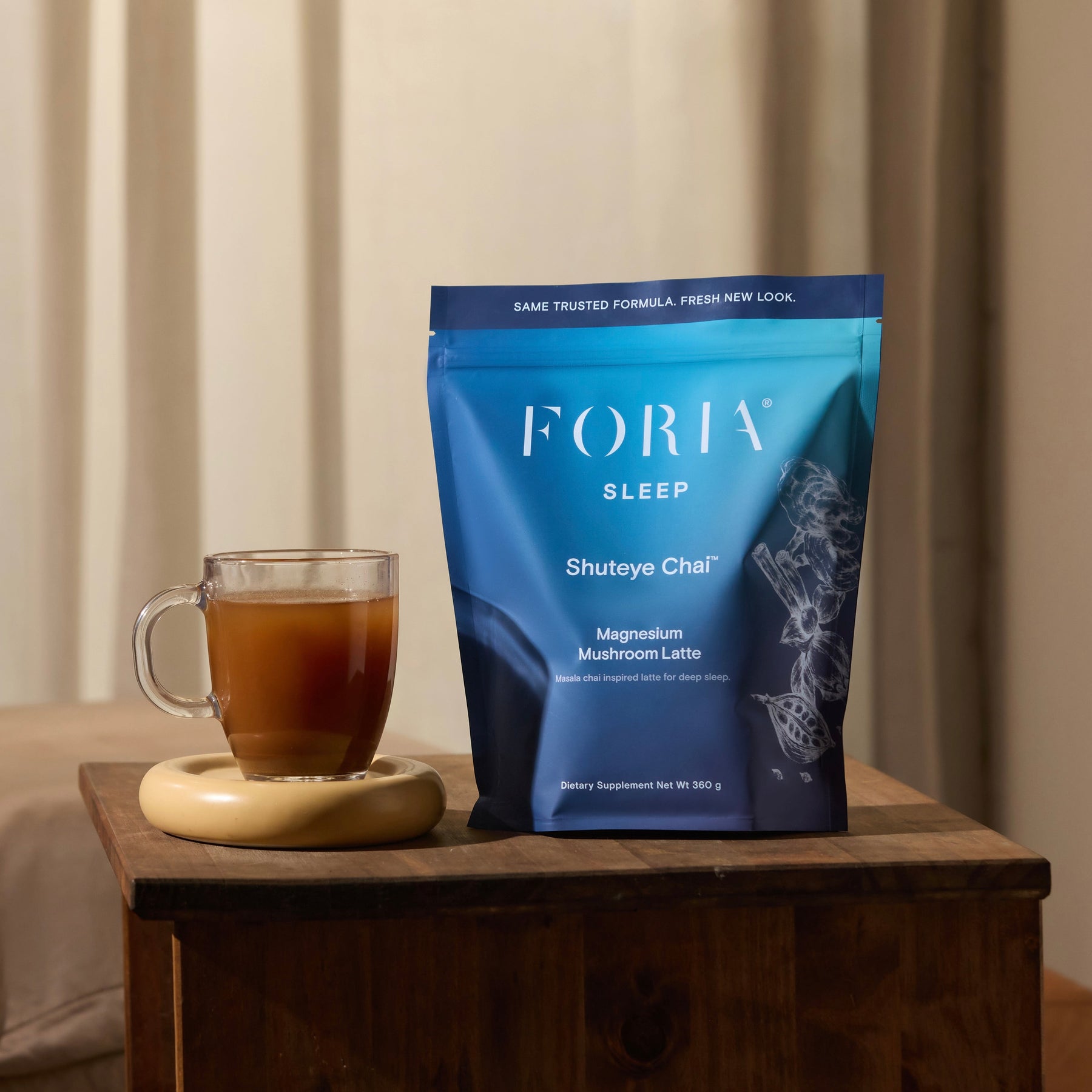 End your day with a ritual that feels as soothing as it is effective. Shuteye Chai is a caffeine-free, dairy-free latte crafted with magnesium, l-theanine, reishi functional mushroom, and calming adaptogens, all wrapped in warming masala chai spices. Each sip melts tension, quiets the mind, and guides you toward the kind of rest your body craves. Your gentle invitation to drift off and dream deeply. Each bag includes 30 servings.
