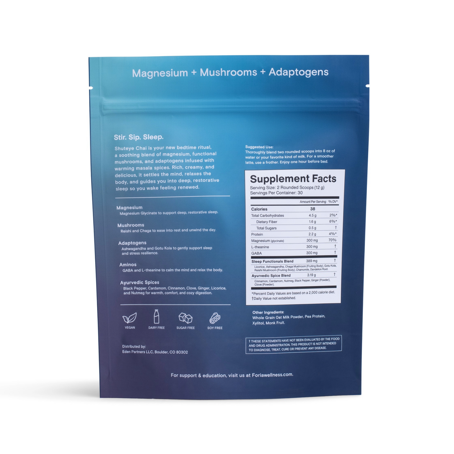 Magnesium glycinate, gaba, l-theanine, chaga, reishi, ashwagandha, chamomile, dandelion root, gotu kola, ayurvedic spices, black pepper, cardamom, cinnamon, clove, ginger, licorice, whole grain oat milk powder, pea protein, monkfruit, xylitol