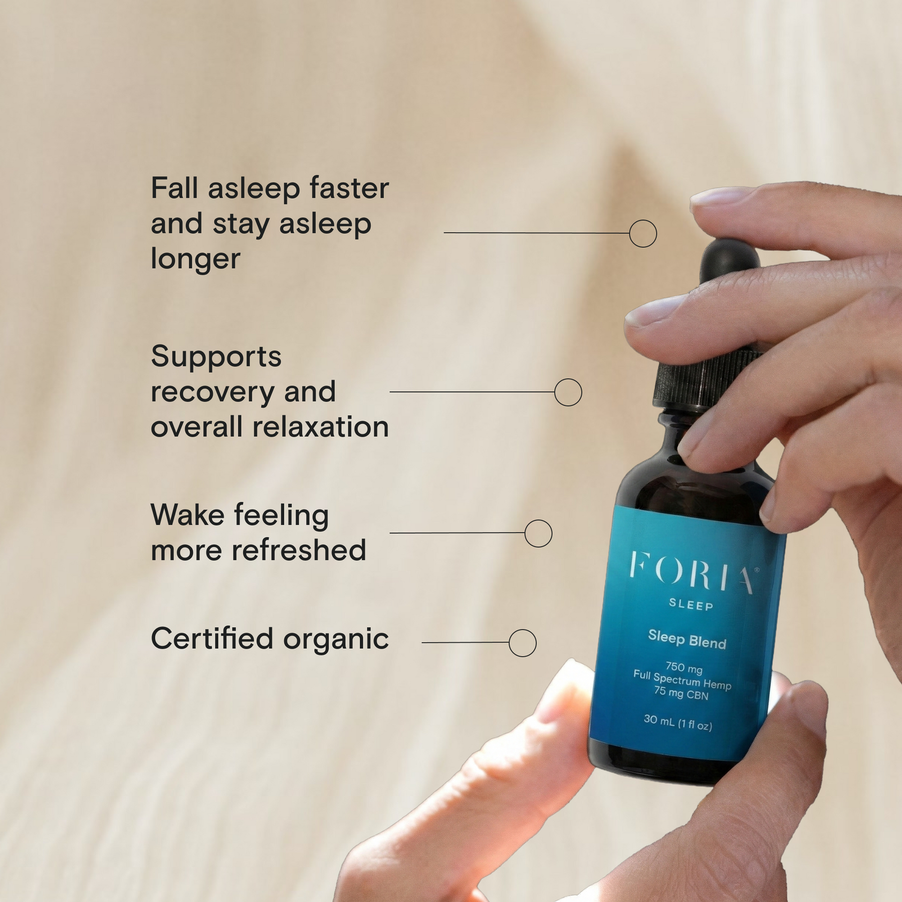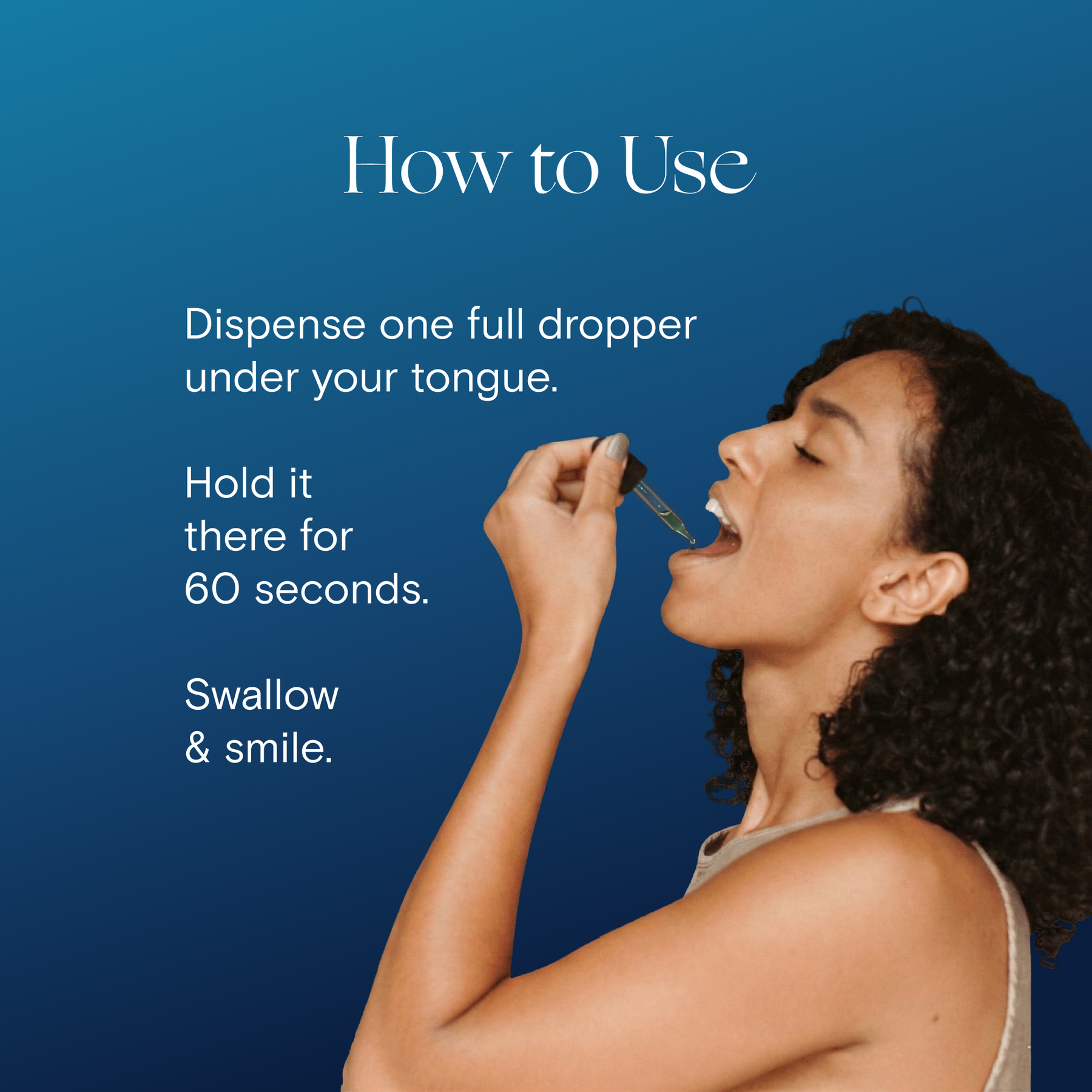 2. Place one dropper of Sleep CBD Tincture under the tongue. Hold for 60 seconds.