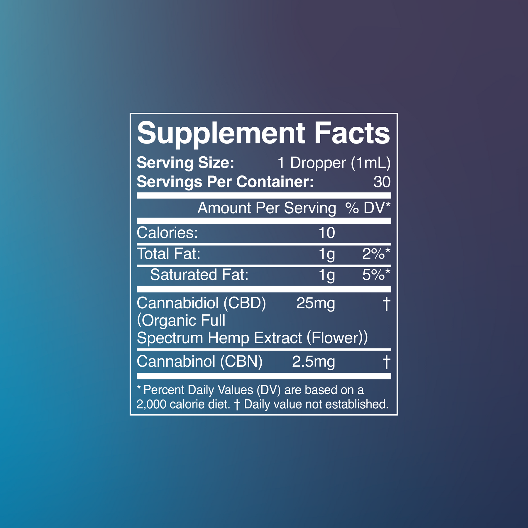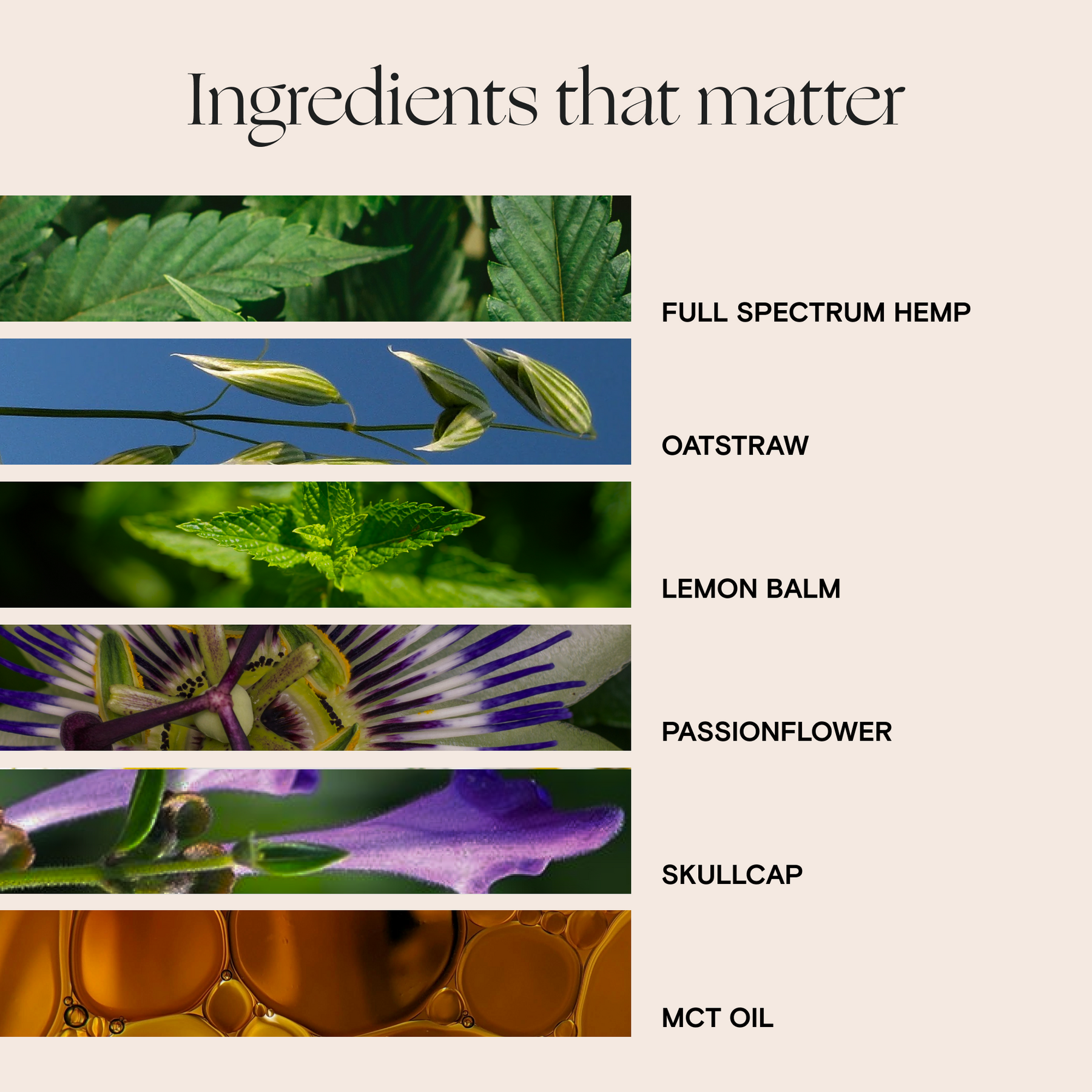 MCT oil*, Oatstraw*, Lemon balm*, Passionflower*, Skullcap*, Full Spectrum Hemp*, CBN